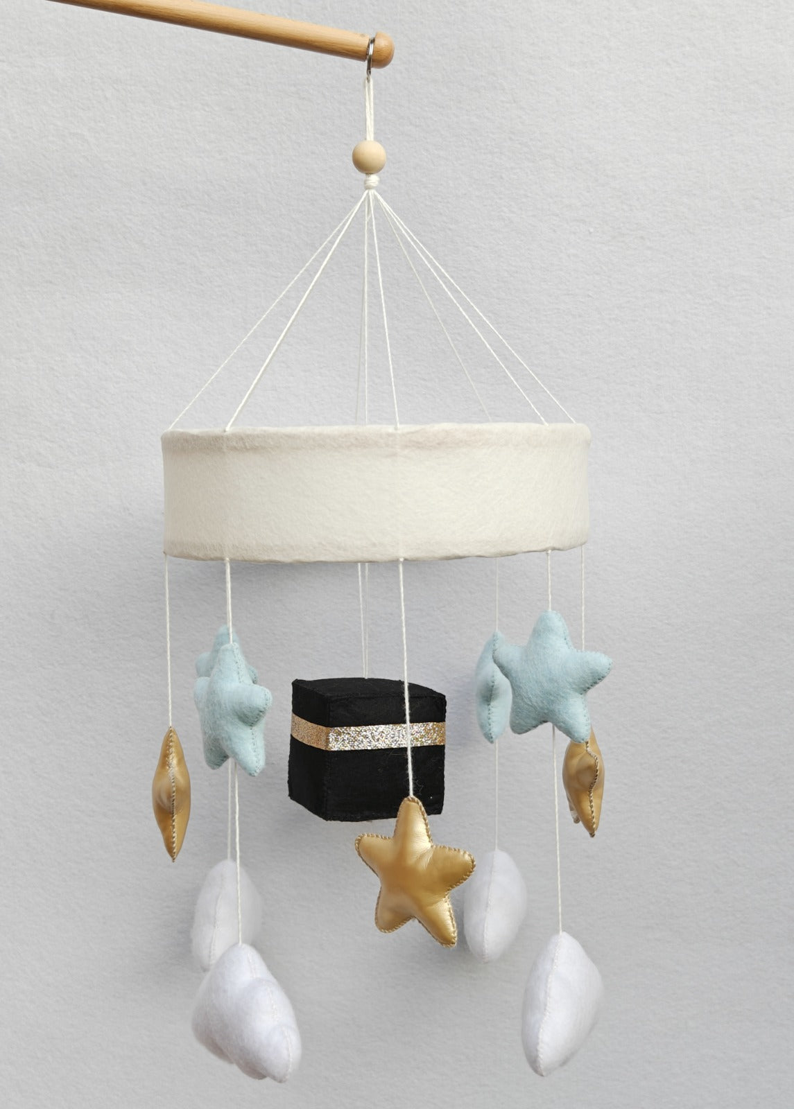 Offrez à votre enfant un sommeil paisible avec ce magnifique mobile coranique pour bébé bleu, entièrement fait à la main et personnalisé avec son prénom.